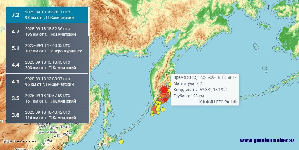 Rusiyanın Geofizika Xidmətinin məlumatına görə, Kamçatka yarımadası sahillərində 7,2 maqnitudalı güclü zəlzələ qeydə alınıb.